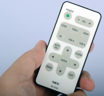 NEC NP-L51W+投影機的遙控器設計得極為小巧簡潔,采用英文備注,鍵位設計合理,按鍵手感出色。對于需要經常攜帶的用戶來說,極為方便。不過用戶需謹慎保管以免丟失導致無法操控投影機。
