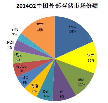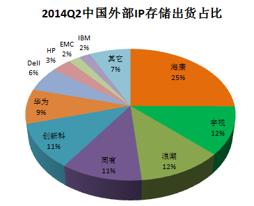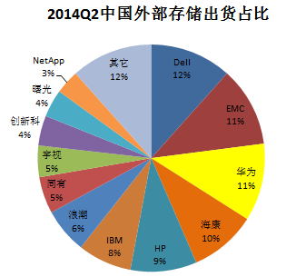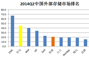 從出貨量角度分析,2014年第二季度前5名中國產(chǎn)廠商除華為以11%排名第三外,海康威視以10%超越HP、IBM位列第四位,一、二、五位被DELL、EMC、HP占據(jù),IBM跌出前5。國產(chǎn)廠商增長強勁。