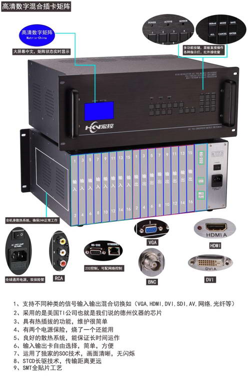 MDI矩陣可以混合輸入輸出多種信號如:HDMI,DVI,VGA,YUV,SDI,AV等信號混合輸入輸出。