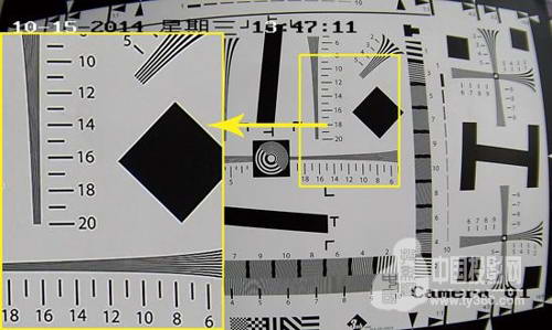 檢測1-清晰度:在最小變倍下將該機對準清晰度測試卡,其水平清晰度為1060TVL,垂直清晰度達到1100TVL,邊緣清晰度則為850TVL。
