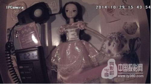 檢測1-暗室環境:將置于暗箱的攝像機(F=1.4,降噪開至最大)對準布娃娃及照度計,搖擺件則位于布娃娃前方,調低暗箱燈光之亮度,在照度值由17.52Lux降至6.08Lux的過程中,除卻降噪開啟所導致搖擺件邊緣出現輕微模糊外,其他幾乎無改變,畫面清晰且色彩準確;0.91Lux時,畫面出現輕微色衰,搖擺件亦稍有拖影,但清晰度頗高,畫面的細節完整豐富,娃娃邊上的文字清晰可辨;0.86Lux時,該機切換成黑白模式,切換后的畫面亮度適宜,娃娃五官清晰,發絲細節栩栩如生;照度計顯示為0.00Lux時(實際照度在0.005Lux以下),此時與開始黑白切換時的畫面比較,除卻亮度稍減外,其他表現幾乎無別;此外彩色模式下,該機在照度值為0.005Lux以下時依然具備可用性,其星光級超低照度性能名副其實。