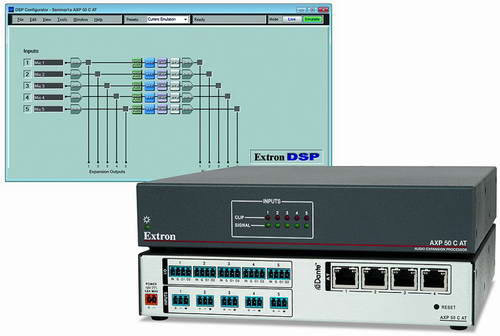Extron 電子很高興地推出了 AXP 50 C AT,這是一款 5 路輸入音頻擴(kuò)展處理器,具有 Extron ProDSP 功能,可將遠(yuǎn)端麥克風(fēng)和其它信號(hào)源集成到支持 Dante™ 的 Extron DMP 128 音頻系統(tǒng)。通過單根以太網(wǎng)電纜可將多臺(tái) AXP 50 C AT 設(shè)備鏈接到中央設(shè)備,節(jié)省了為每一路麥克風(fēng)單獨(dú)鋪設(shè)電纜所需的人工和費(fèi)用。AXP 50 C AT 為麥克風(fēng)/線路輸入提供 48 V 的幻像電源。并為每路輸入提供專用的信號(hào)處理,包括增益、濾波、動(dòng)態(tài)調(diào)整和回聲消除(AEC)功能。使用直觀的 DSP 配置器(DSP Configurator)軟件能快速和輕松地對 AXP 50 C AT 的 DSP 參數(shù)和回聲消除進(jìn)行設(shè)置。