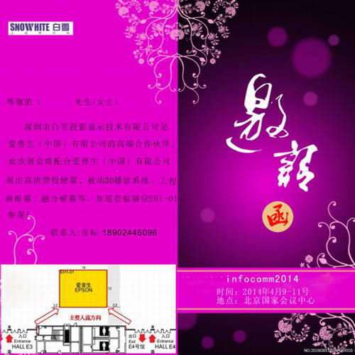 經(jīng)過近幾年的發(fā)展,白雪投影幕在中國(guó)高端投影銀幕市場(chǎng)占有較大份額。與諸多世界一流投影企業(yè)合作,緊跟世界投影技術(shù)的發(fā)展,為客戶提供完美的視覺享受。此次Infocomm China 2014展會(huì)中,深圳市白雪投影顯示技術(shù)有限公司作為愛普生(中國(guó))有限公司的高端合作伙伴,將配合愛普生(中國(guó))有限公司展出高清背投硬幕、被動(dòng)3D播放系統(tǒng)、工程畫框幕、融合硬幕等,這種強(qiáng)強(qiáng)聯(lián)手的合作方式,必將共“贏”市場(chǎng)。歡迎各位蒞臨展位EH1-01。