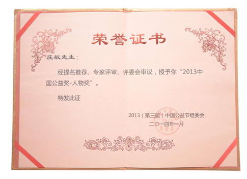 “2013中國公益獎(jiǎng)——人物獎(jiǎng)”榮譽(yù)證書