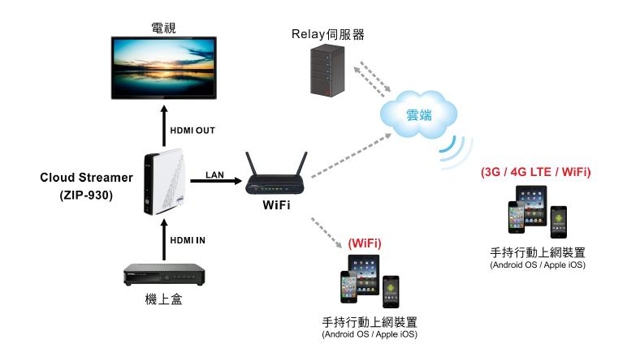 ZIP-930的安裝也很簡單,用網線連接ZIP-930和無線路由器,HDMI IN口連接藍光機(或機頂盒),HDMI OUT口可連接本地電視等顯示設備。手持設備安裝好Vpier333這個APP后,家里的手機、平板電腦利用局域網內的WiFi即可收看藍光機播放的內容,戶外用戶通過WiFi/3G/4G也能收看到家里正在播放的電視節目。
