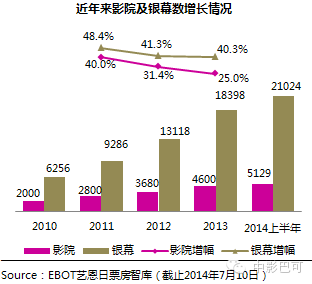 截止到6月30日,中國內地影院數量達5107家,銀幕數已突破2萬大關,達到20902塊。從2011年至2013年增速來看,影院數量和銀幕數量雙下滑,去年影院增幅下滑至25%。截止7月10日,今年共計新增影院529家。影院數量和銀幕數量增速的雙下滑,也就意味著國內影院建設已經開始趨于飽和狀態,那在這樣的前景下,市場又正在發生些什么變化呢?