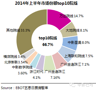 這里有一個特別有趣的現象,在2014年上半年中,票房top10院線占比66.7%,市場集中度頗高。其中,萬達院線以近20億元位列第一。 其實呢,越來越多的觀眾們已經拋棄以往為“看電影”而看電影的主觀意識,相反除了對影片本身的訴求之外,院線的設施建設以及帶來的良好觀影體驗,是他們選擇院線并成為習慣的大前提。