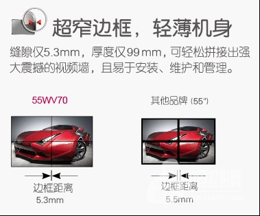 LG55WV70在擁有5.3mm的超窄拼縫的同時,依然繼承了LG優勢的LED背光與IPS硬屏技術,具備了出眾的畫面顯示效果,達到了外在與內在的完美統一。
