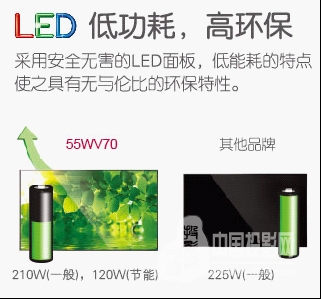 由于LG55WV70所采用的LED背光技術,在提供絕佳色彩表現和亮度的同時,更實現了節能模式下120W的功耗水平,最多實現100W以上的節能效果,待機功耗僅有0.5W,在體現綠色環保理念的同時,更為用戶節省了可觀的運營成本。