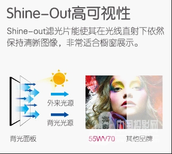此外,LG55WV70還擁有Shine-out濾光片技術,可以有效降低直射光線對畫面的裂化影響,充分滿足櫥窗、展會展示,在日光等強光照時下,依舊能保證顯示圖像的清晰。