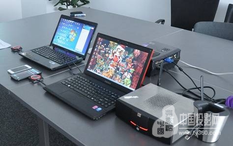 最終,小編實現了兩臺電腦、兩部手機同時在一個投影屏幕上演示。如下圖: