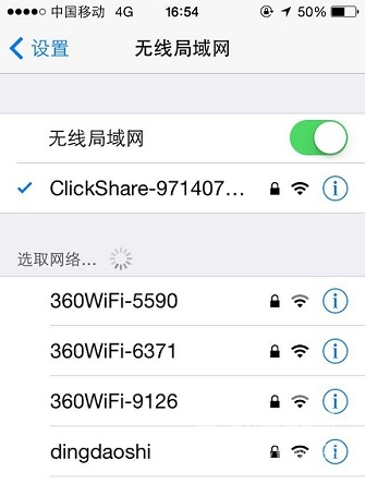 電腦和投影保持以上狀態不動,拿出智能手機,安裝ClickShare APP,在無線網絡中找到ClickShare-xxxx的WIFI并連接。