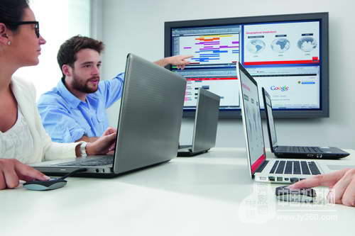 如果是個人演講,當然是需要一個屏幕即可。如果像下圖一樣,某個團隊在開會,需要每個人報告自己的項目,多屏同時投影就顯得很有必要了。這套多屏投影功能會讓整個會議內容一目了然,效率自然提高不少。