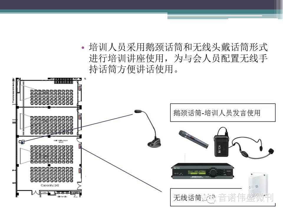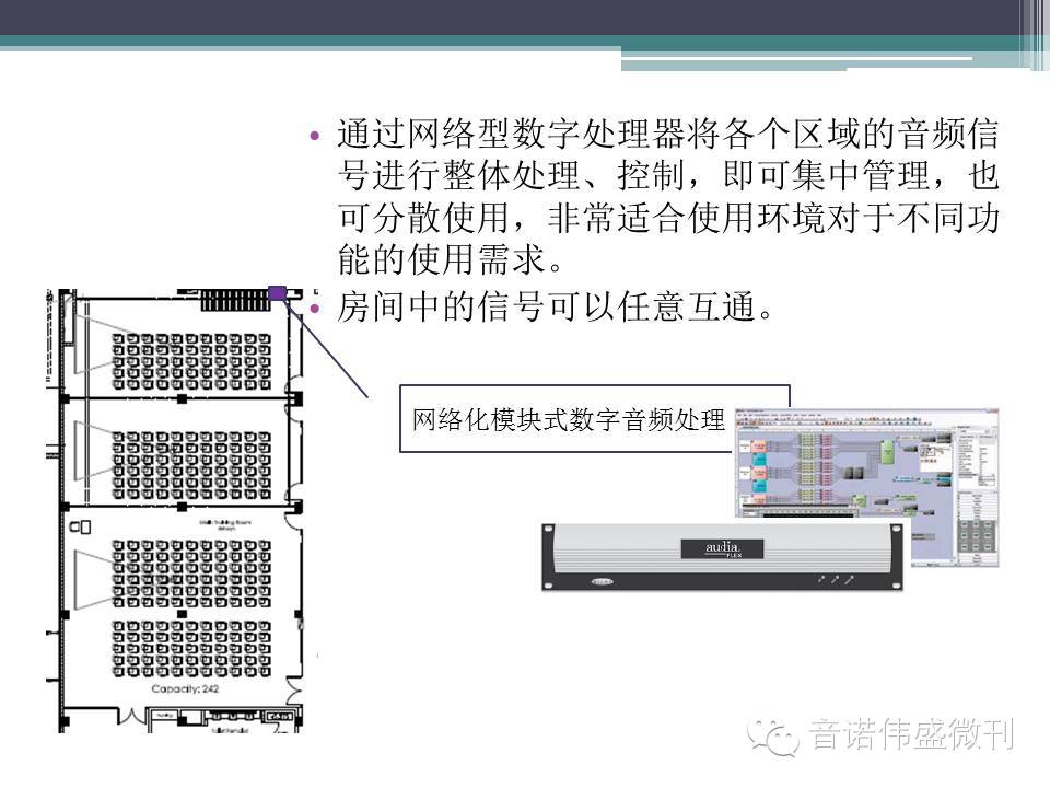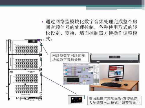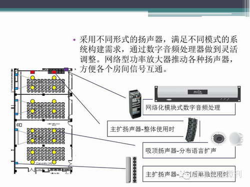 1.音頻系統均以數字化音頻處理器為核心,系統構建方式:音源(PC音頻、討論性會議話筒、無線話筒)+數字音頻處理器(矩陣、分頻、分配、反饋抑制、均衡調節、自動混音等)+功率放大器(多通道)+壁掛揚聲器+吸頂揚聲器,具有操作簡單、易懂等特點,改變了傳統音響系統操作繁瑣、系統設備繁多等狀況。配合集中控制系統控制數字音頻處理器來調整系統模式、音量等功能。​