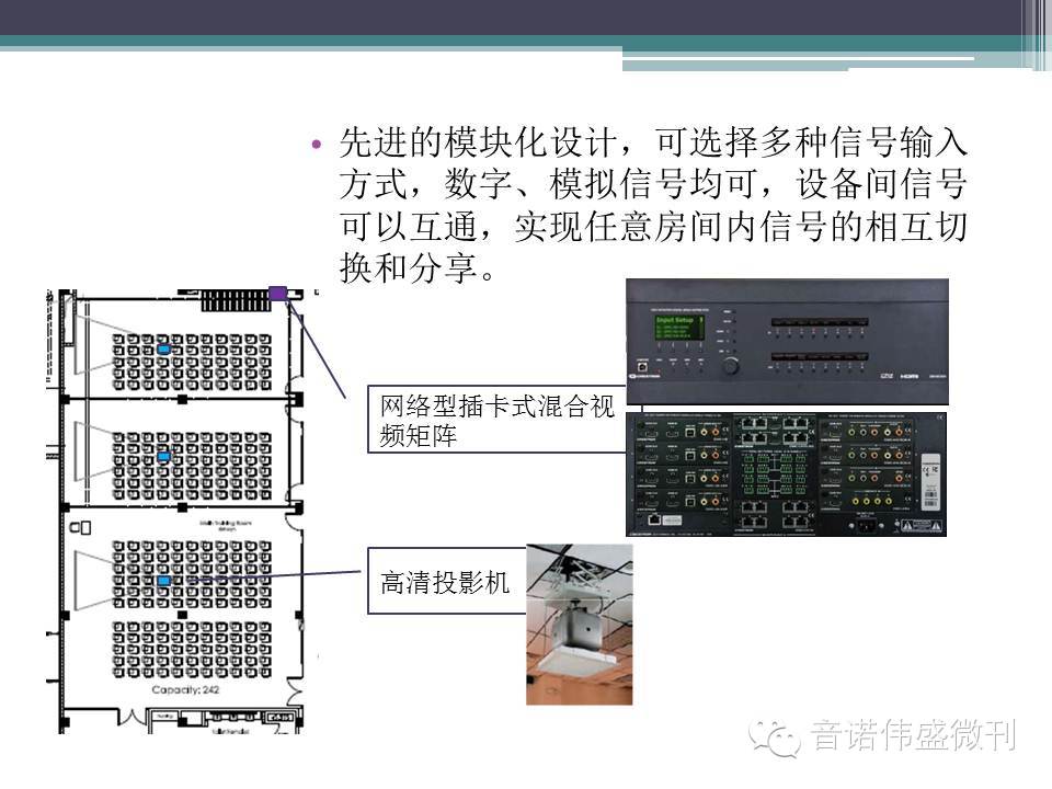 1.配置路數更多、處理功能更為強大的音、視頻矩陣,能夠滿足分割后各個單獨會議室內的音、視頻信號的處理、分配工作。​