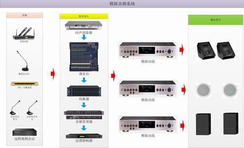 一般多功能廳為例,其在使用模擬音頻擴聲設備時主要由以下5大部分組成。