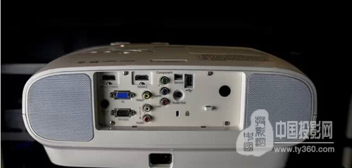 Epson EH-TW6600背部一覽表。左右兩側偌大的網狀機構是Epson EH-TW6600所配備的立體聲20W喇叭,在機構的設計上以及位置上安排得很好,正投的時候可以有效的朝向座位左右雙向發聲,設計上有點類似過往收錄音機左右喇叭的感覺。介面上同樣支援兩組的HDMI In,其中第一組可以支援MHL,因此iPad/iPhone以及Android可以順理成章成為家庭行動媒體中心的一角。其他的界面包含D-Sub,RS-232 DB-9,YCbCr/YPbPr 色差端子,Video複合端子,以及一組的L/R聲音輸入,一組3.5吋耳機接頭聲音輸出,以及中間上方的一組的USB 2.0 Type A 輸入。Epson EH-TW6600對音效輸出輸入能力上面的注重倒是在一般影像顯示裝置比較少見的。