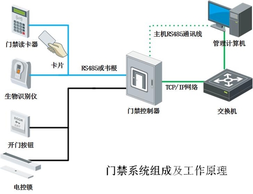 門禁讀卡器(生物識別儀)用來獲取刷卡人員的卡號信息,通過轉換成電信號以韋根或RS-485的方式傳送給門禁控制器,門禁控制器將接收到的卡號與控制器里存儲的卡號權限進行比對判斷,判斷該刷卡人員是否能夠在此時間段進出,根據判斷的結果完成開鎖、保持閉鎖等動作。聯網型門禁控制器可以通過RS485總線或TCP/IP網絡與管理計算機聯網,控制器可以接收來自管理計算機發送的人員和卡號權限信息,也可以將事件記錄發送給管理計算機。計算機裝有門禁系統的管理軟件,作為系統中數據的分析與處理。