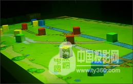 第二個展項,是兩臺索尼VPL-F420HZ吊頂垂直投影配合交互系統實現的積木互動桌面,小朋友們可以化身成為“交通建筑師”,在投影打造的“沙盤”上設計不同的交通軌道路徑,而設計的方式就是用顏色不同的海綿方塊積木,它們可以在桌面上聯通鐵路、河流、飛機。紅色的方塊一字排開,馬上它們中間就由鐵路連接起來,小火車也開了出來,如果連接的足夠多,還可以升級為高鐵線路。藍色積木連接的是河流,綠色積木是公路,黃色積木是飛機航線,最后,可以建造起來了一個四通八達的交通體系。這個展項畫面優美,童趣盎然。