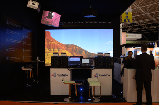 在AVANZA 8-H322的展會現場,展出了兩大展項:N x K LASER + CLOUD PROJECTION SYSTEM、立方體顯示器。據AVANZA現場工作人員介紹,此次展出的兩個展項均是通過AVANZA Event實現的。兩個展項既可同步播放片源、也可各自獨立播放。第一個展項N x K LASER + CLOUD PROJECTION SYSTEM,是利用4臺高清激光工程投影以2×2的方式融合打造的4K大屏幕,可以實現云端操作,支持3D播放。該展項最大特點是可以實現任意尺寸的融合拼接、高清顯示、高亮度寬色域和低功耗等技術優勢;第二個展項是立方體顯示器,由2臺激光工程投影機融合打造而成,該展項最大的挑戰是投影機需翻轉57度同時水平旋轉12度,而這一點充分展現出了AVANZA激光工程投影機720度安裝的優勢。