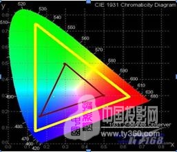 這種混合的光要比傳統(tǒng)白光的色域?qū)掃_(dá)3倍以上一般的傳統(tǒng)燈泡型投影機(jī)、單片液晶投影機(jī)、液晶電視的彩色范圍一般在30---65%左右(圖2中的褐線區(qū)域)。RGB(紅綠藍(lán))LED色光的色純度很高,色序成像原理上完全取消了彩色膜或色輪等影響色彩的中間環(huán)節(jié),投影出來(lái)的圖像鮮艷生動(dòng),彩色范圍(Color Gamut)高達(dá)120%NTSC以上(見(jiàn)圖2中的黃線區(qū)域)。