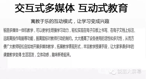 從液晶式電子白板在教育領(lǐng)域的應(yīng)用前景,伴隨著互動(dòng)多媒體技術(shù)融合技術(shù)的進(jìn)一步發(fā)展,大尺寸(有98寸、84寸、70寸等等)及高端新品的不斷升級(jí)和創(chuàng)新,促使觸摸一體機(jī)產(chǎn)品開(kāi)拓應(yīng)用新領(lǐng)域不斷拓展與擴(kuò)大,從現(xiàn)在市場(chǎng)應(yīng)用前景來(lái)看互動(dòng)觸摸一體機(jī)在商務(wù)領(lǐng)域、大型展會(huì)、主題活動(dòng)中都得到了較為廣泛和普遍的使用。這意味著觸摸一體機(jī)不僅局限于教育市場(chǎng),同時(shí)向商務(wù)市場(chǎng)及高端市場(chǎng)進(jìn)軍。(更多資訊可登陸銳麗官網(wǎng):www.銳麗商城.com)