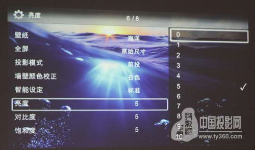 打開設(shè)置菜單,可以看到圖像設(shè)置、視頻設(shè)置、音樂設(shè)置、圖片設(shè)置、節(jié)能模式以及語言設(shè)置等等。在這些設(shè)置中,關(guān)鍵的參數(shù)設(shè)置應該說是圖像設(shè)置,在圖像設(shè)置中,用戶可以設(shè)置投影模式、墻壁顏色校正、智能設(shè)定、亮度、對比度和飽和度設(shè)置,而在視頻設(shè)置中并沒有這些參數(shù)的選定,如果用戶想調(diào)整視頻的參數(shù),用戶可以在圖片設(shè)置中搞定。