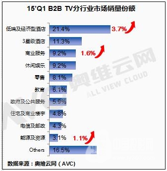 2014年Q1商用電視市場,TOP10行業(yè)銷量份額達83.5%,其中近年來各大連鎖酒店品牌下的商務(wù)酒店、中檔酒店快速擴張,帶動了對商用電視的需求,其中Q1低端及經(jīng)濟型酒店行業(yè)份額同比增長3.7個百分點,增長明顯;此外,商業(yè)服務(wù)行業(yè)里涵蓋的智慧醫(yī)療、智慧養(yǎng)老、智慧餐飲等智慧化產(chǎn)業(yè)的發(fā)展也拉動了商用電視的部分需求。