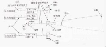 激光光源采用多臺中高功率紅、綠、藍激光器疊加輸出高功率,從理論上講沒有極限功率限制。目前在巴可或科視的3片DLP技術數字電影放映機上,使用光功率總計約150瓦的紅、綠、藍激光器就可以實現10000-12000流明光通量輸出,并且如果實現3萬流明的光通量輸出,只需要增加激光器的數量就可以,即3萬流明輸出的激光光源壽命與1萬流明的一致,并不增加單位成本。