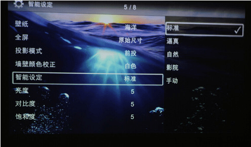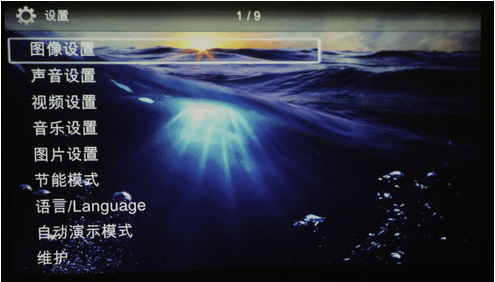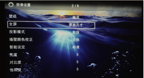 打開設置菜單,可以看到圖像設置、視頻設置、音樂設置、圖片設置、節能模式以及語言設置等等。在這些設置中,關鍵的參數設置應該說是圖像設置,在圖像設置中,用戶可以設置投影模式、墻壁顏色校正、智能設定、亮度、對比度和飽和度設置,而在視頻設置中并沒有這些參數的選定,如果用戶想調整視頻的參數,用戶可以在圖片設置中搞定。