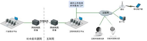 特別需要注意的是,因互聯網視頻云平臺部署于互聯網環境中,而鑒于互聯網環境的復雜性,其對社會面資源網乃至公安視頻專網造成了相當大的網絡安全威脅。因此,互聯網視頻云平臺與行業整合平臺的互聯互通成為在整個系統的安全性設計的重中之重,建議采用絕對安全的物理方式,進行網絡邊界的安全隔離。其示意圖如下圖所示: