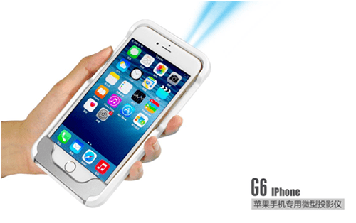 美高公司2016伊始推出的iphone6系列專用鑲嵌微型投影儀,為世界首款蘋果iphone6系列手機鑲嵌微型投影儀。Iphone6各型號手機鑲嵌到美高G6微型投影儀,融為一體,可以同屏投出100吋大屏,擴展蘋果手機的大屏娛樂和分享。