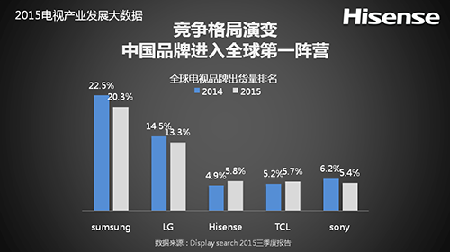 2015年,全球彩電市場格局悄然發生變化,日系品牌日漸式微,中國品牌迅速崛起。美國全球統計機構IHS公布的數據顯示,2015年前三季度,海信電視全球銷量占有率為5.8%,超越索尼,躍居全球前三,全球五強品牌中國品牌占據兩席。