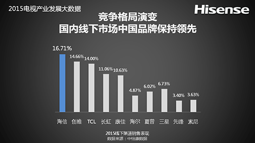 國內彩電線下市場表現看, 中國品牌依然保持領先。根據中怡康統計數據,2015年,海信液晶電視的零售量和零售額占有率分別為:16.71%、16.51%,雙雙高居第一位,并超出第二名兩個百分點以上,至此,海信平板電視已經連續12年高居行業第一位。