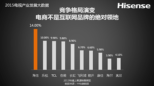 2015年,相繼10多家互聯網電視企業進入中國彩電市場。海信認為,互聯網品牌對市場的沖擊是有的,但率先完成智能化轉型并擁有深厚技術底蘊的傳統企業依然可以保持自己的領先優勢,電商不是互聯網品牌的絕對領地。截止2015年12月27日中怡康線上監測周報年累數據顯示,海信線上市場零售量和零售額的占有率分別為14.0%和14.5%,雙雙高居第一位,超出第二名4個百分點。