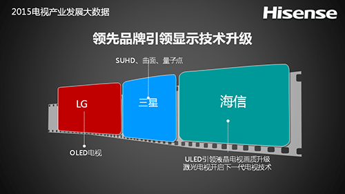 2015年,由全球領先品牌發起的顯示技術升級成為行業發展關鍵詞。不論是三星的SUHD、LG的OLED,還是海信的ULED和激光影院電視,都代表了當今全球彩電市場的最高水平,它們都是通過在顯示技術上的創新,推動了產業升級,做大了高端市場。
