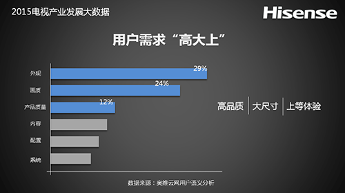 2015年消費者需求呈現出“高大上”的特點:高品質、大尺寸和上等體驗。外觀、畫質、產品質量、內容、配置、智能系統是消費者購買時考慮的關鍵要素。外觀、畫質最受用戶關注,提升外觀工藝、提升畫質水平是彩電企業后續非常重要的創新方向。