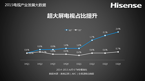 2015年,消費市場對超大屏電視的需求快速增長,65寸、70寸等超大屏幕市場的增勢更為顯著,在過去的一年里,70寸的市場份額增長了一倍以上。其中激光影院電視將進一步激發用戶對超大屏電視的需求。