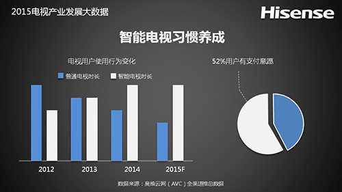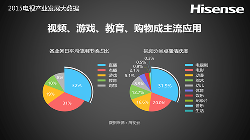 中國電視用戶的使用行為已經發生變化,2015年,用戶使用智能電視的平均時長為3.5小時,而且有52%用戶有使用智能電視的支付意愿,用戶已經逐步接受視頻、游戲、教育、購物等付費內容。由此可見,中國用戶不是不看電視了,而是開始習慣使用在線電視。海信海視云針對1582萬智能電視激活用戶的研究數據顯示,視頻點播、游戲、教育、購物成為最受歡迎的應用,未來客廳經濟的雛形已初步呈現。