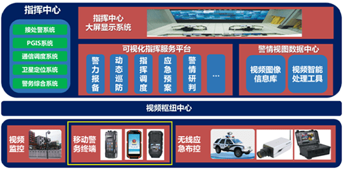 海康威視超高分顯示實戰平臺系統包含前端監控前端、移動手持警務終端產品,如單兵、警務通、執法記錄儀等,無線應急布控產品如車載取證系統、無線攝像機、無線基站等,前端產品獲取的視頻信息,均通過傳輸專網,整合到視頻樞紐中心,為可視化指揮提供視頻基礎,在后端指揮中心,提供一套指揮平臺、一個數據中心、一套大屏系統的完整系統解決方案。可視化實戰平臺體系如圖1所示。