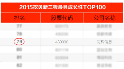 羊歌盛世方報(bào)捷,猴舞新春又呈祥,值此辭舊迎新之際,同輝信息又迎來(lái)好消息。近日,挖貝新三板研究院聯(lián)合挖貝網(wǎng)發(fā)布了《2015挖貝新三板最具成長(zhǎng)性TOP100》榜單,同輝信息從2031家公司中脫穎而出,位列榜單第79位。