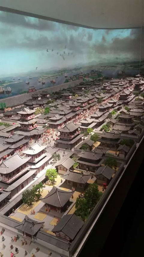 在明堂有一個壯觀的洛陽城沙盤,此沙盤模型制作面積達到130多平米,模型比例1:800。整個模型既要真實還原隋唐時期的洛陽古城,還要完整體現現今五大遺址的位置分布。沙盤背景墻投影使用了五臺科視DWU555-GS激光投影機,在屏幕上顯示隋唐時代洛陽城的動態人文圖像,與靜態的沙盤交相呼應,生動形象的為人們展示了隋唐時代洛陽普通百姓的風俗習慣和日常生活。