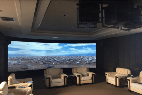 天安金馬中心影音室由于承載著VIP接待、高端會議、視頻賞析等功能,對于顯示終端設備的要求很高,在進行了多種方案的對比之后,最終決定采用弧形幕投影方式。NEC PX581W+投影機有著6000流明高亮度、720P高清分辨率,進行弧形融合后可以全角度、全方位的為來賓展示企業文化、產品、服務等視頻資料,大大提升客戶觀看體驗。考慮到影音室面積、燈光等實際因素,該項目沒有簡單的采用3臺融合的方式,而是6臺投影機先進行兩兩疊加,再進行弧形融合,保證了畫面超過10000流明的充沛顯示亮度,用兼顧性價比和效果的方式充分滿足了客戶的需求,為客戶打造超高清晰度畫面投影效果。