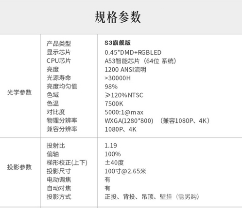 酷樂視S3天屏影院是全球首款真實亮度超千流明LED智能投影,獲得“國家數字音視頻及多媒體產品質量監督檢驗中心”認證亮度:1081ANSI流明,符合SMPTE (美國動畫與電視工程協會)規定的家庭影院亮度標準,分辨率為1280*800(支持1080p/4k硬解碼),即使在白天不拉窗簾的情況下也能為用戶提供鮮活明亮、栩栩如生的超百寸3D巨幕。著名音箱品牌惠威(HiVi)為S3量身定做的HiFi音響系統除了擁有更加大的揚聲單元和腔體外,還增加了杜比環繞、人聲獨白等技術,這使得S3的音效更為明亮、有層次,同時加入了藍牙音箱功能、同軸音頻輸出接口,音響系統更為科學實用。
