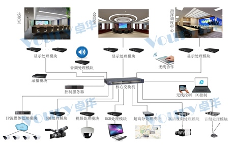 Voury卓華網(wǎng)絡分布式控制系統(tǒng)可最大限度的接入各種信號源,進行處理顯示,Voury卓華可根據(jù)用戶需求進行擴展級聯(lián),保證所有信號的集中處理顯示。