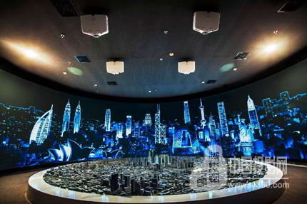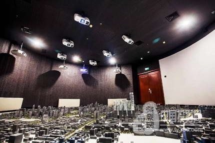展廳內部,一個直徑長達8米的實體沙盤位列正中,其上布滿了大大小小樓宇模型,一面12米×3米的弧形大屏幕佇立在沙盤的后面,使得原本空間不大的展廳頓時有些“擁擠”。在展廳的安裝中,工作人員主要考慮的是現場光線的問題,既最大限度降低弧形屏幕的亮度對沙盤投影效果的影響,同時投影機也要讓弧形屏幕畫面完整、畫質清晰、色彩艷麗,讓屏幕的亮度與沙盤的投影亮度能夠完美融合。在安裝過程中,工作人員采用吊頂安裝的方法,分別為弧形大屏和沙盤安裝了合適角度的投影機,5000:1的對比度和1024×768分辨率可以勝任展廳內的投影需求,10臺愛普生CB-G6150工程投影機通過定制演示片源,將沙盤及弧幕融合為整體投影畫面,給觀者震撼的視頻盛宴。