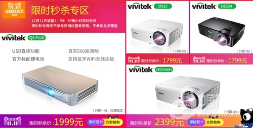 在本次Vivitek(麗訊)天貓旗艦店“11.11”的五重驚喜中,限時秒殺活動無疑是最刺激和最吸引人的,秒殺活動涉及Vivitek(麗訊)微投QUMI Q3 Plus、商教機型D552、D555WH、DS234四款機型,活動時間為11月11日0:00—1:59:59,在兩個小時的時間內(nèi),QUMI Q3 Plus、D552、D555WH、DS234四款機型的秒殺價分別為1999元、1799元、2399元、1799元,相比于原價優(yōu)惠都達到了數(shù)百元,數(shù)量有限,先“秒”先得,而且這樣的冰點價格足可以秒殺很多高端電視和同類投影機。