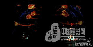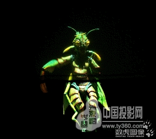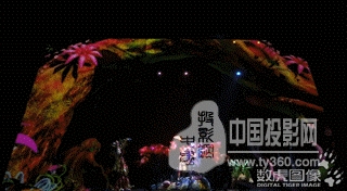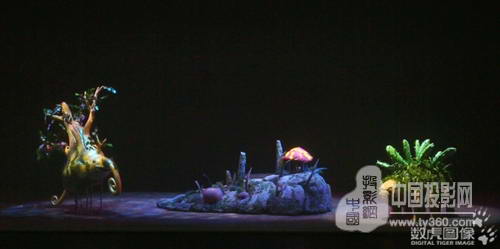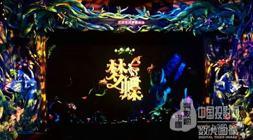 裸眼3D的舞臺(tái)效果則通過(guò)精美的舞臺(tái)置景、舞美道具和多媒體影像結(jié)合呈現(xiàn)。為呈現(xiàn)真實(shí)奇幻的原始森林場(chǎng)景,設(shè)計(jì)團(tuán)隊(duì)充分發(fā)揮想象,將食人花、鬼面蝶、毛毛蟲(chóng)、大龍魚(yú)、螳螂等眾多森林動(dòng)植物都搬上舞臺(tái),營(yíng)造盡可能真實(shí)的森林場(chǎng)景。同時(shí)采用正投紗幕、背投膜和異形投影膜結(jié)合,呈現(xiàn)極具縱深感的裸眼3D立體視覺(jué)效果。