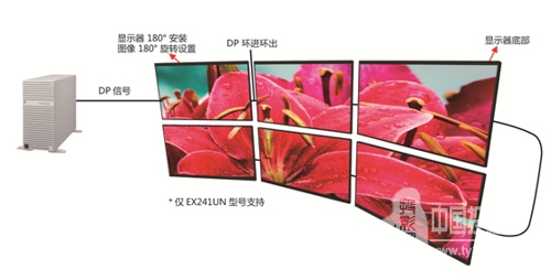 通過NEC獨有的Tile Matrix自拼接功能,在無需外設的情況下可輕松實現5*5的拼接方案。此拼接方案不似以往的普通拼接,由NEC自拼接功能加之圖像180度翻轉和顯示器180度安裝、DP視頻信號環出來實現。