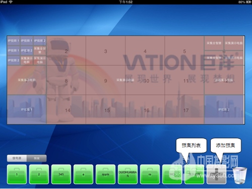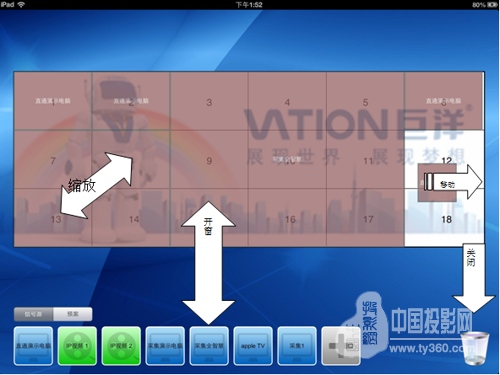 VATION巨洋SMART TOUCH移動控制系統與其他移動控制系統最大的區別在于對信號源的操作,當前大屏幕市場采用的移動控制終端皆是對預案的簡單調用,即前期在控制電腦上設置好整屏的顯示模式、信號開窗方式保存成預案,然后通過移動終端直接調用,這種調用只能是固定的顯示方式,而VATION巨洋SMART TOUCH控制系統是完全獨立于控制電腦的,可以完全取代控制電腦實現對信號源的操作,實現預案設置及任意信號源的調用、疊加、漫游等各種操作。